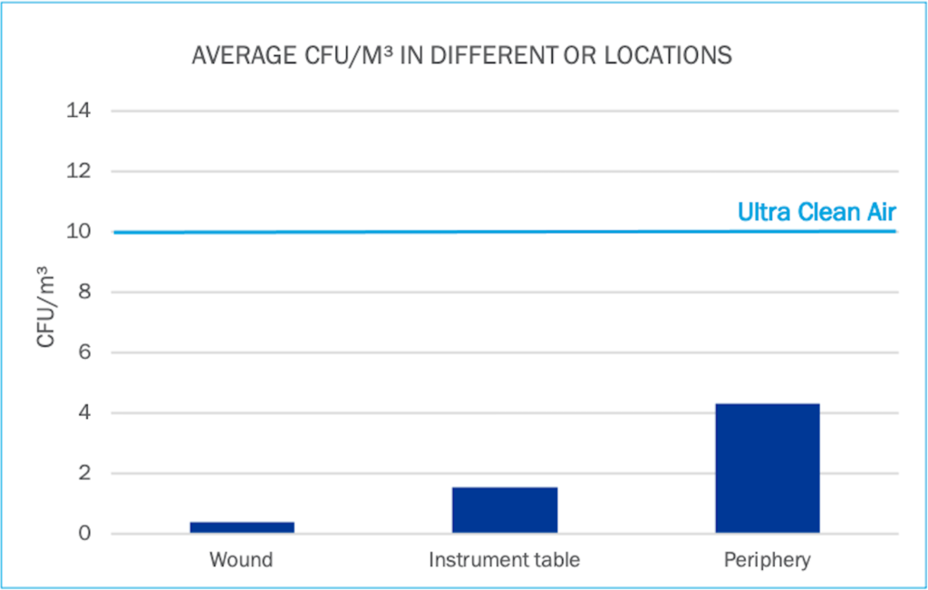 to be more effective in maintaining ultra-clean conditions of <10 CFU/m3 throughout the entire room during live surgery.